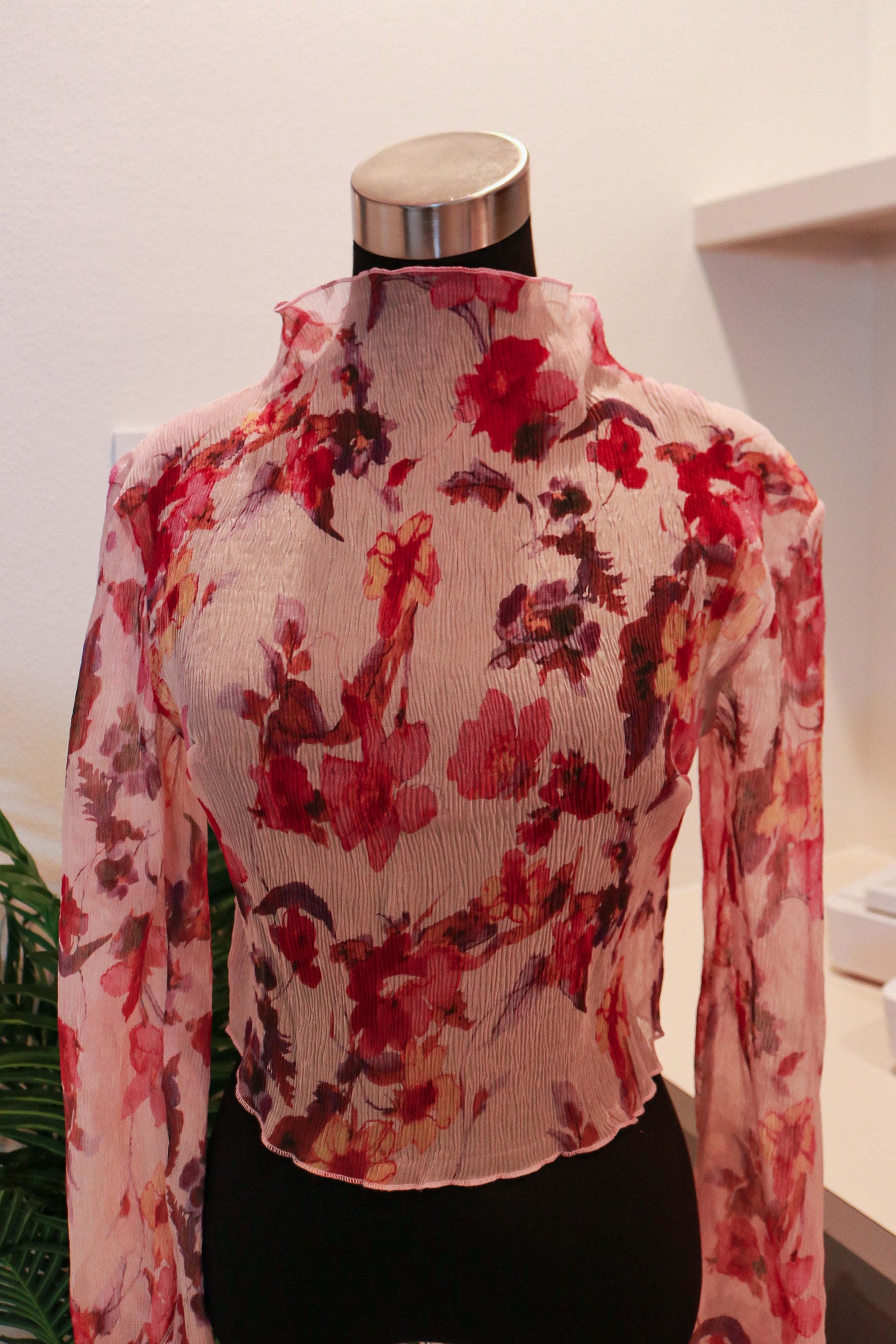 The Long-sleeves Floral Blouse is crafted from lightweight crinkle crepe fabric, providing breathability and comfort. Its feminine design enhances versatility, making it suitable for various occasions. The fabric's texture offers a subtle elegance, while its lightweight nature ensures ease of movement throughout the day.